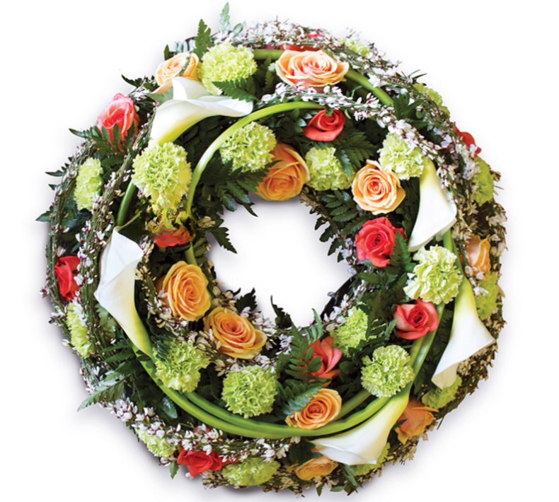 Oeillet vert, Aster blanche, Rose saumon, Rose orange, Callas blanc