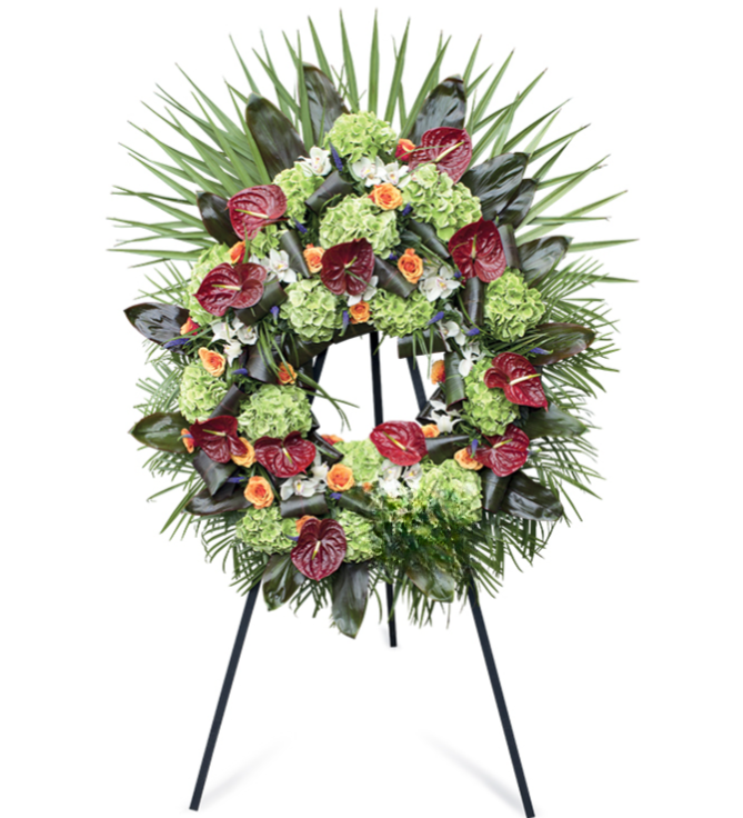 Cordyline rouge, Rose orange, Veronique bleu, Anthurium bordeaux, Hortensia vert, Lentisque, Cymbidium blanc 12 fleurons