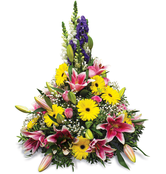 Rose rose, Gerbera jaune, Muflier blanc, Delphinium bleu, Lys rêve, Gypsophile blanc, Lentisque
