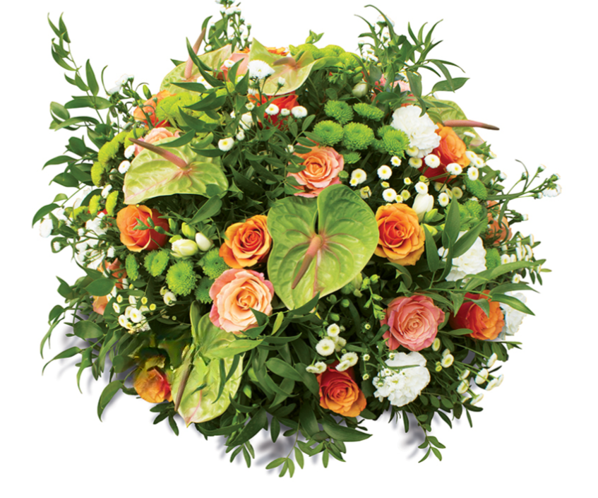 Rose orange, Santini vert, Oeillet blanc, Matricaire blanc, Aster blanche, Anthurium vert, Lentisque