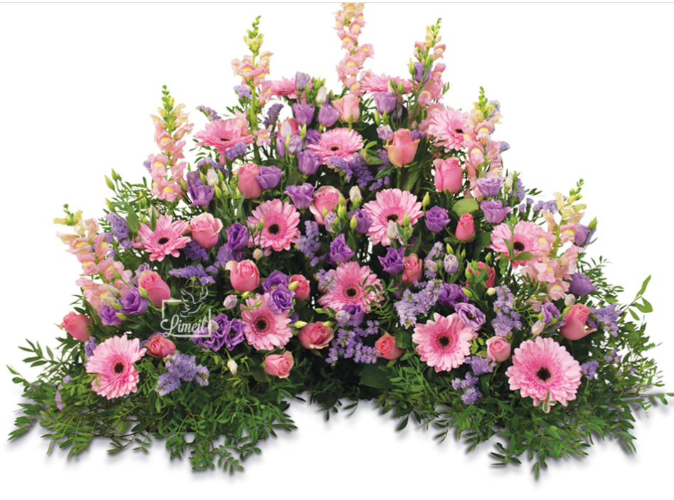Gerbera rose, Rose rose, Muflier rose, Lisianthus parme, Statice mauve, Lentisque long