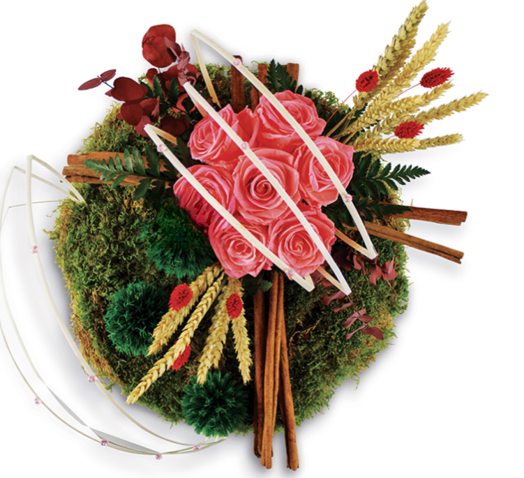 Blé naturel stab, Rose saumon stab, Baton de cannelle stab, Rattan blanc souple stab, Chardon vert stab, Eucaplyptus rouge stab, Mousse plaquette stab, Fougere stab