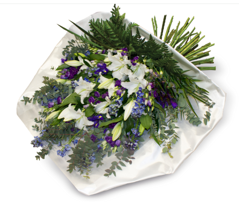 Iris bleu, Lys multi blanc, Delphinium bleu, Eucalyptus