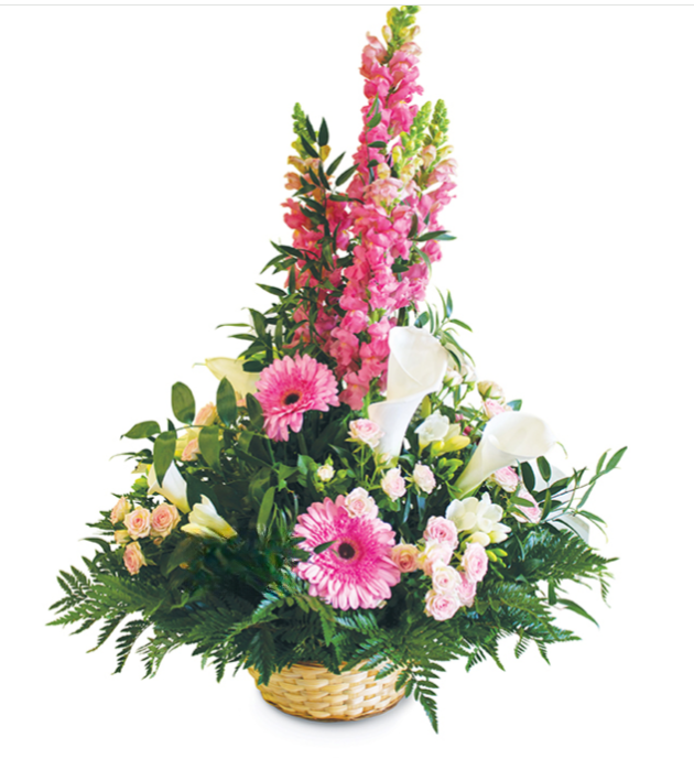 Rose rose branchue, Matricaire blanc, Gerbera rose, Callas blanc, Muflier rose, Ruscus d’Italie