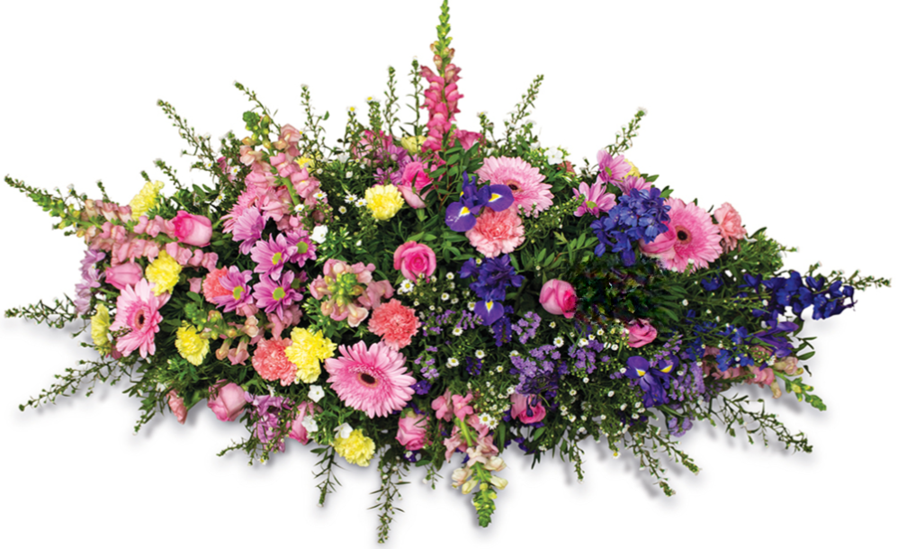 Aster blanche, Iris bleu, Rose rose, Alstromeria blanc, Oeillet jaune, Oeillet rose, Delphinium bleu, Muflier rose, Gerbera rose, Bonny rose, Statice bleu, Lentisque