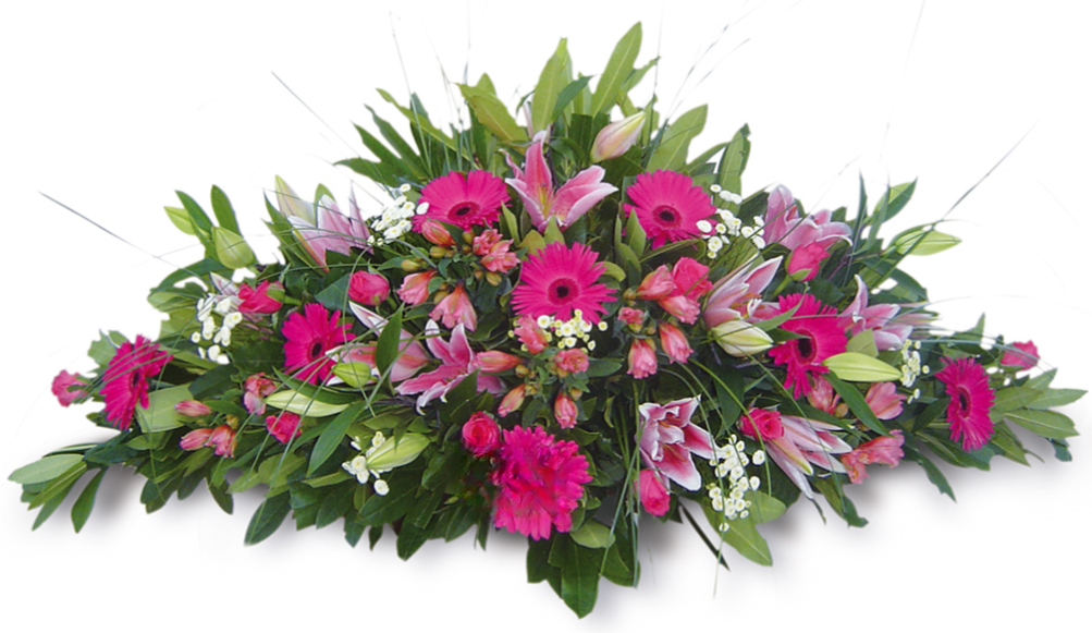 Aster blanche, Iris bleu, Rose rose, Alstromeria blanc, Oeillet jaune, Oeillet rose, Delphinium bleu, Muflier rose, Gerbera rose, Bonny rose, Statice bleu, Lentisque